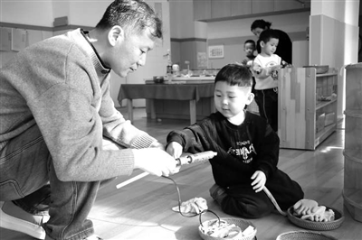 教師與幼兒一起制作打掃教室的工具。 韓生輝 供圖
