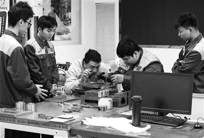 圖為楊登輝(中)指導(dǎo)學(xué)生提升器件加工精度。